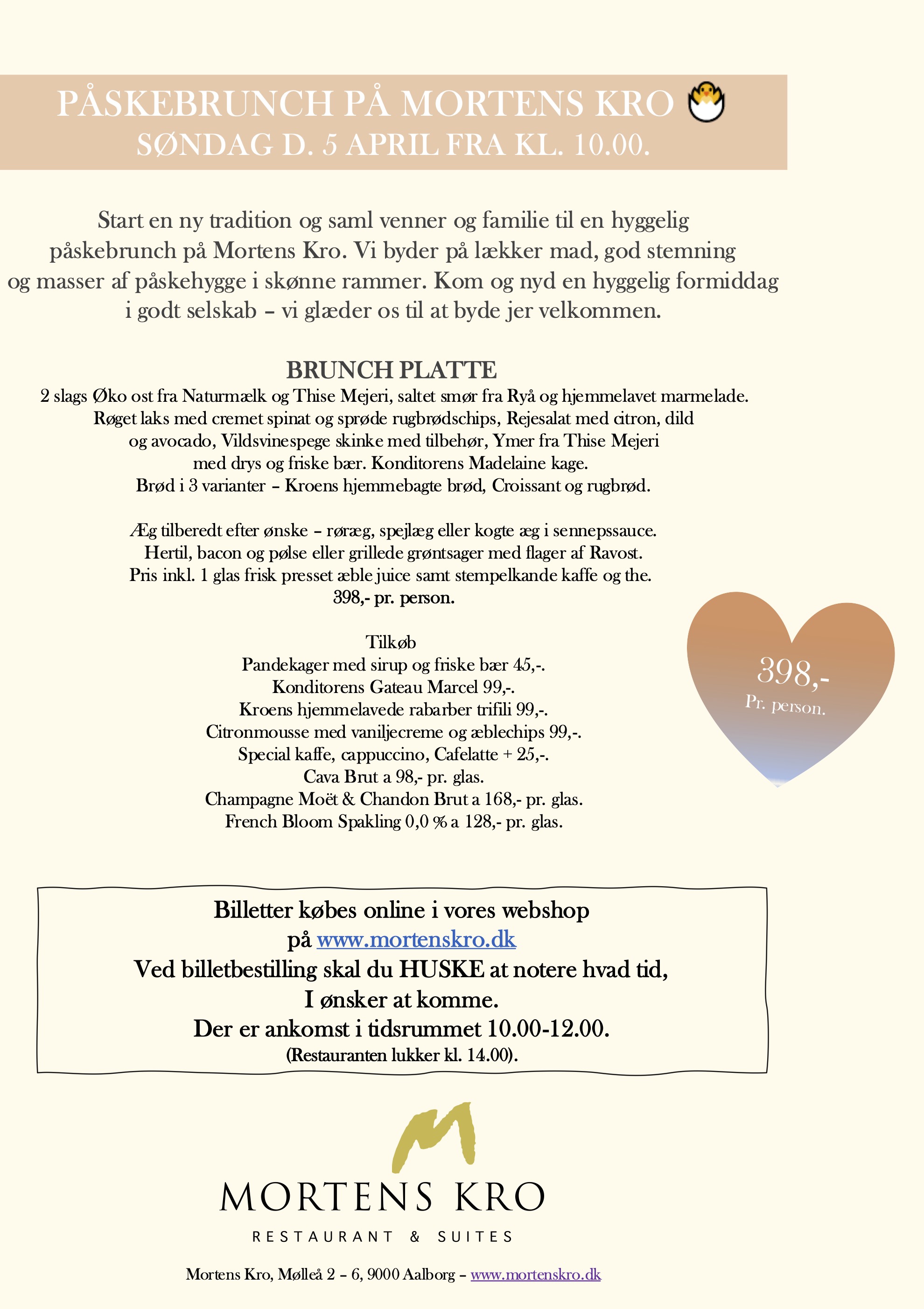 Brunch slutter kl 14.00. Man kan kun deltage ved køb af billet som samtidig er jeres bordreservation.