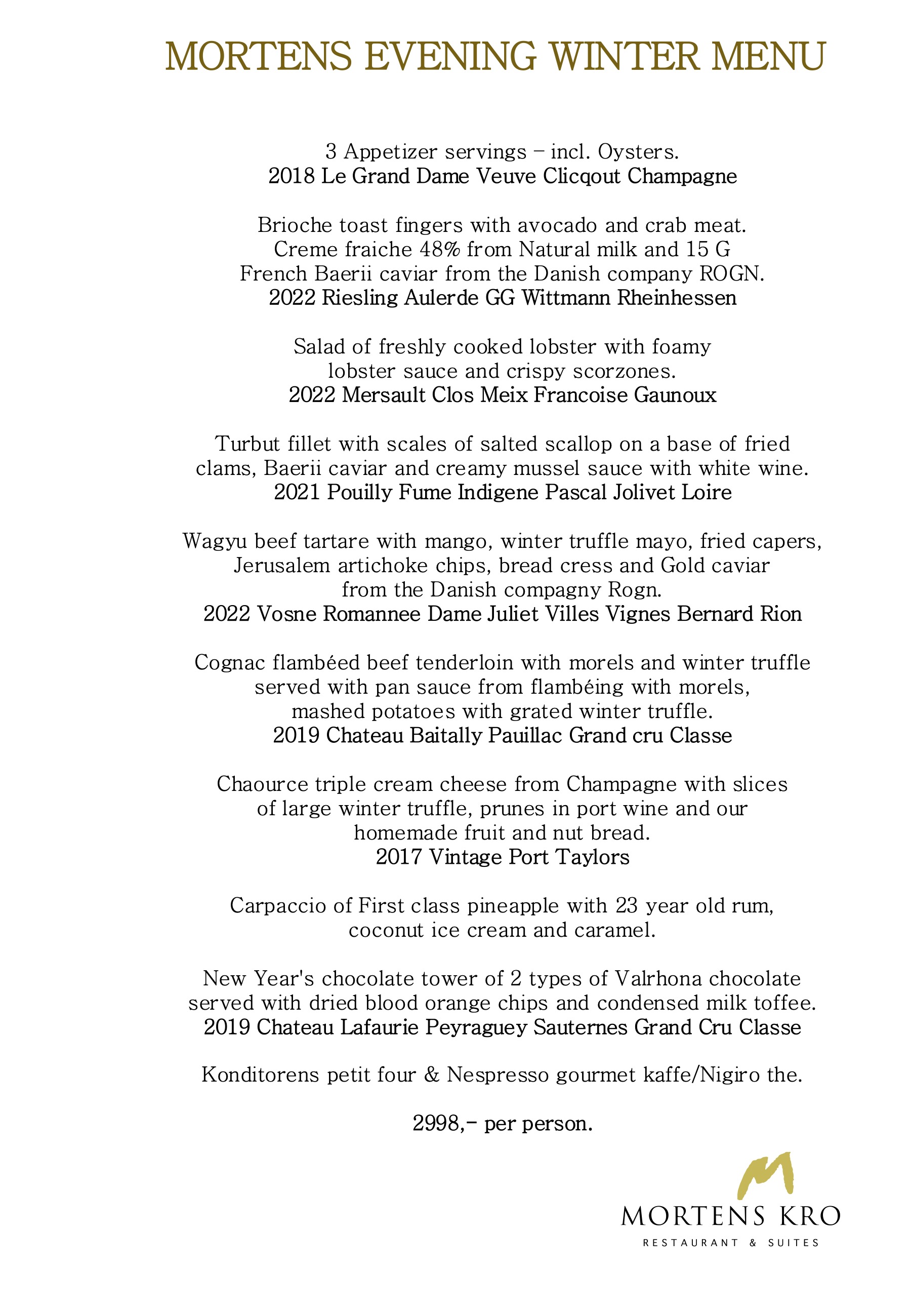 Hver aften er Mortens aften på Mortens kro - Vores helt store menu med -udsøgte champagner og vine for den fuldendte oplevelse.