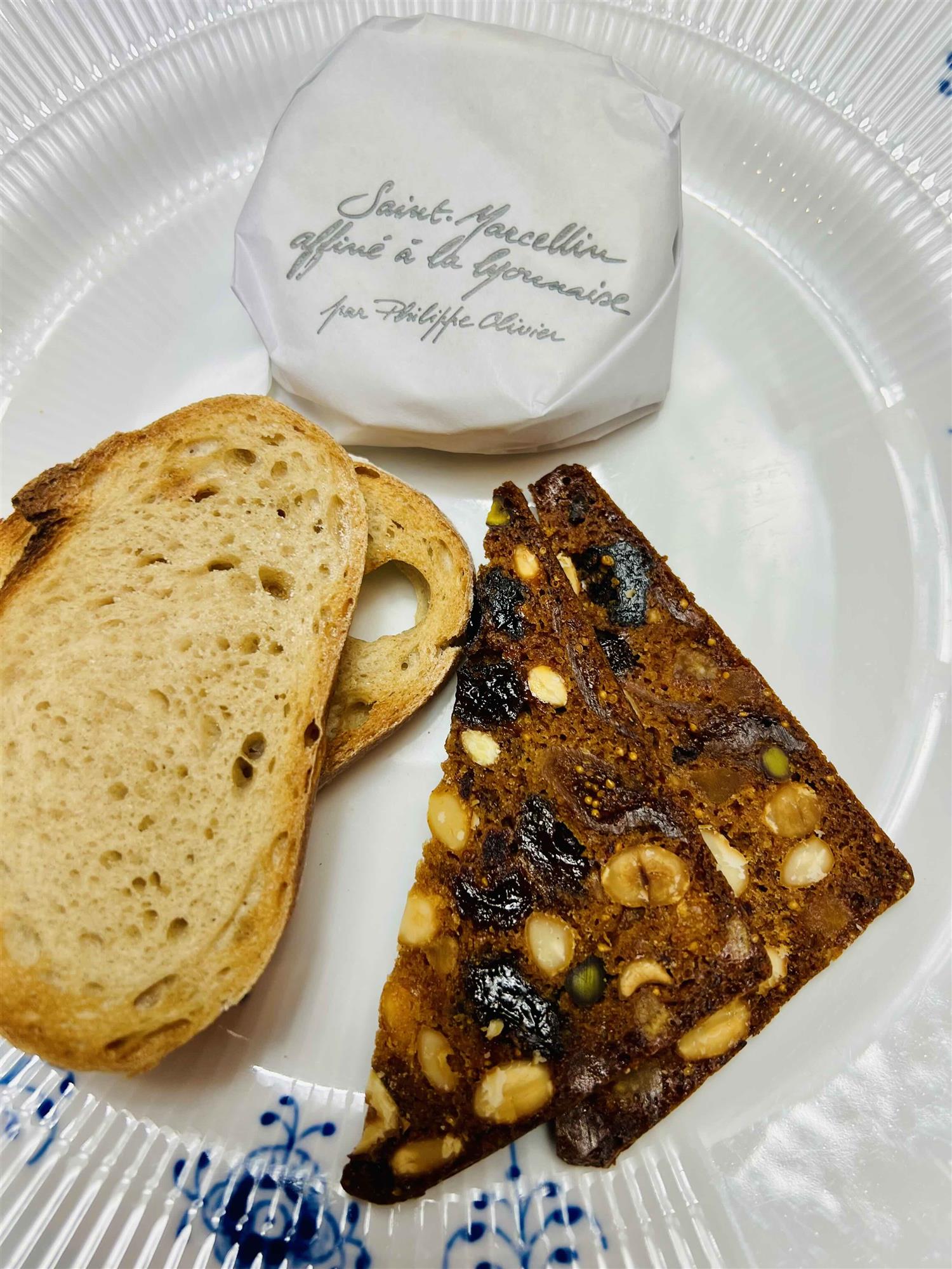 Cremet fed komælks ost hvidskimmel ost på rå mælk fra Byen Saint Marcelin i Rohne- daupine 80g lavet siden 1500 tallet. Med hjemmebagt frugt og nøddebrød ( Anretningen er beragenet til 1 person)